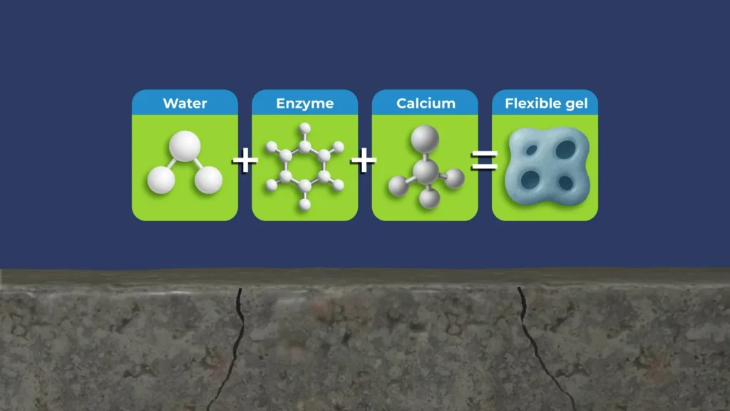Teknologi seperti TechCrete 2500 dari Alchemco menggunakan cairan enzimatik khusus yang diaplikasikan ke permukaan beton. Setelah diserap, cairan ini: